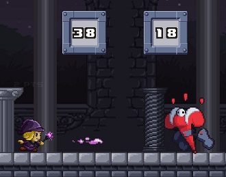 In the lower left, you see your mage character. From the right side, the first monster comes toward you to attack! TIP: The longer you continue the game, the faster the monsters become.